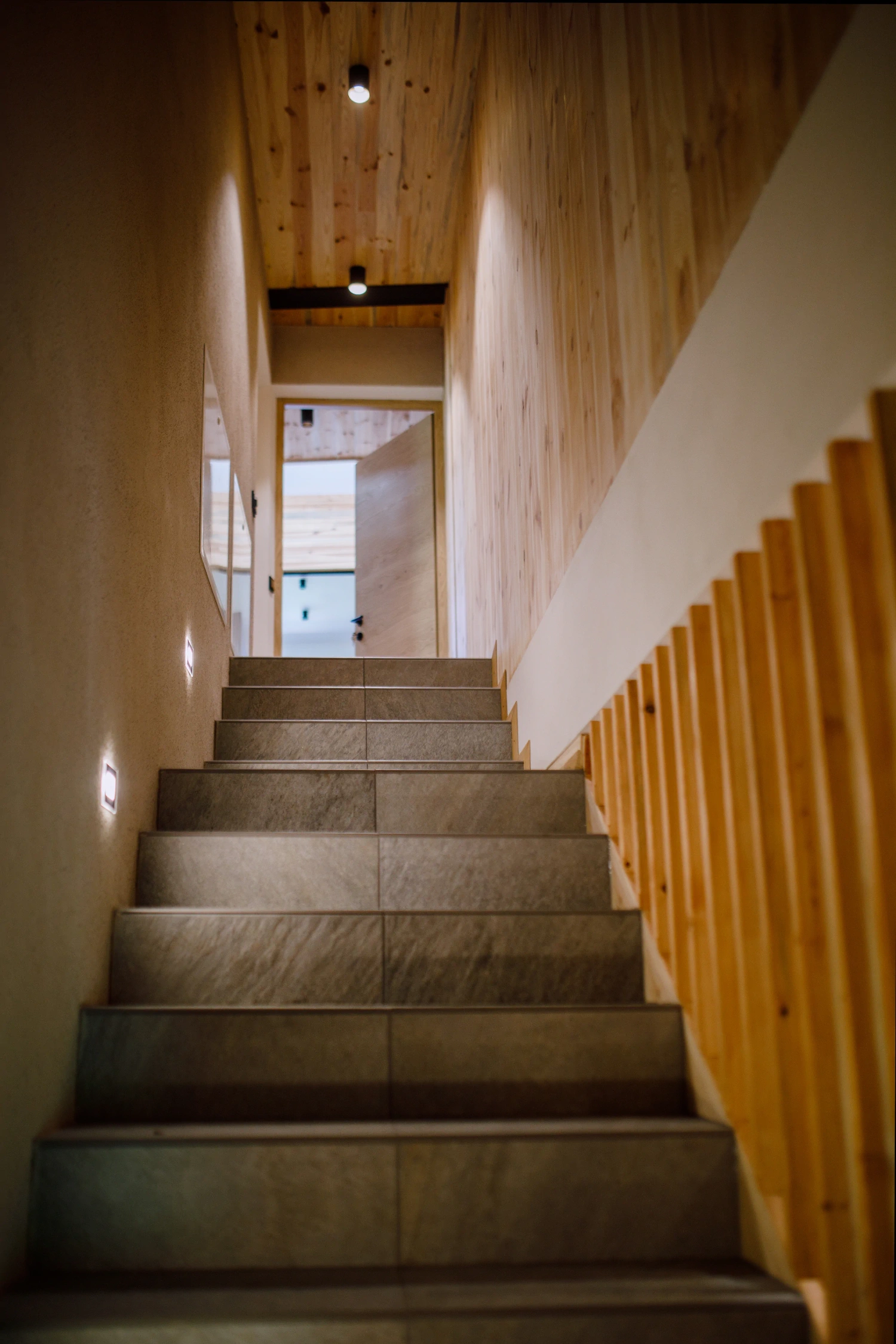 Dafür wurde kein Baum gefällt. Das Holz, welches wir dafür verwendet haben, war ausschließlich Fallholz aus dem eigenen Föhren-Wald. Flori hat es eigenhändig aus dem Wald geholt und von einer Firma vom Ritten zu Leimbindern verarbeiten lassen. Alle Handwerker stammen aus der nahen Umgebung und als gelernter Tischler ließ es sich Flori natürlich auch nicht nehmen, von Beginn an bei jedem Schritt des Baues dabei zu sein. Die meisten Möbel in den Wohnungen stammt aus Floris Händen und dem Holz vom Hof.